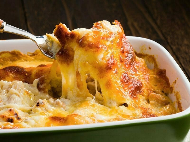 Cuit au jus de veau, puis gratiné à l’Emmental.